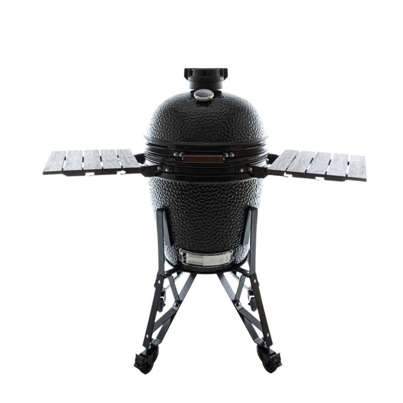 Incluye: Base para platos, deflector cerámico, cesto de carbón de acero inoxidable y recolector de cenizas de acero inoxidable. Se suministra completo con base rodada y mesas laterales de bambú.